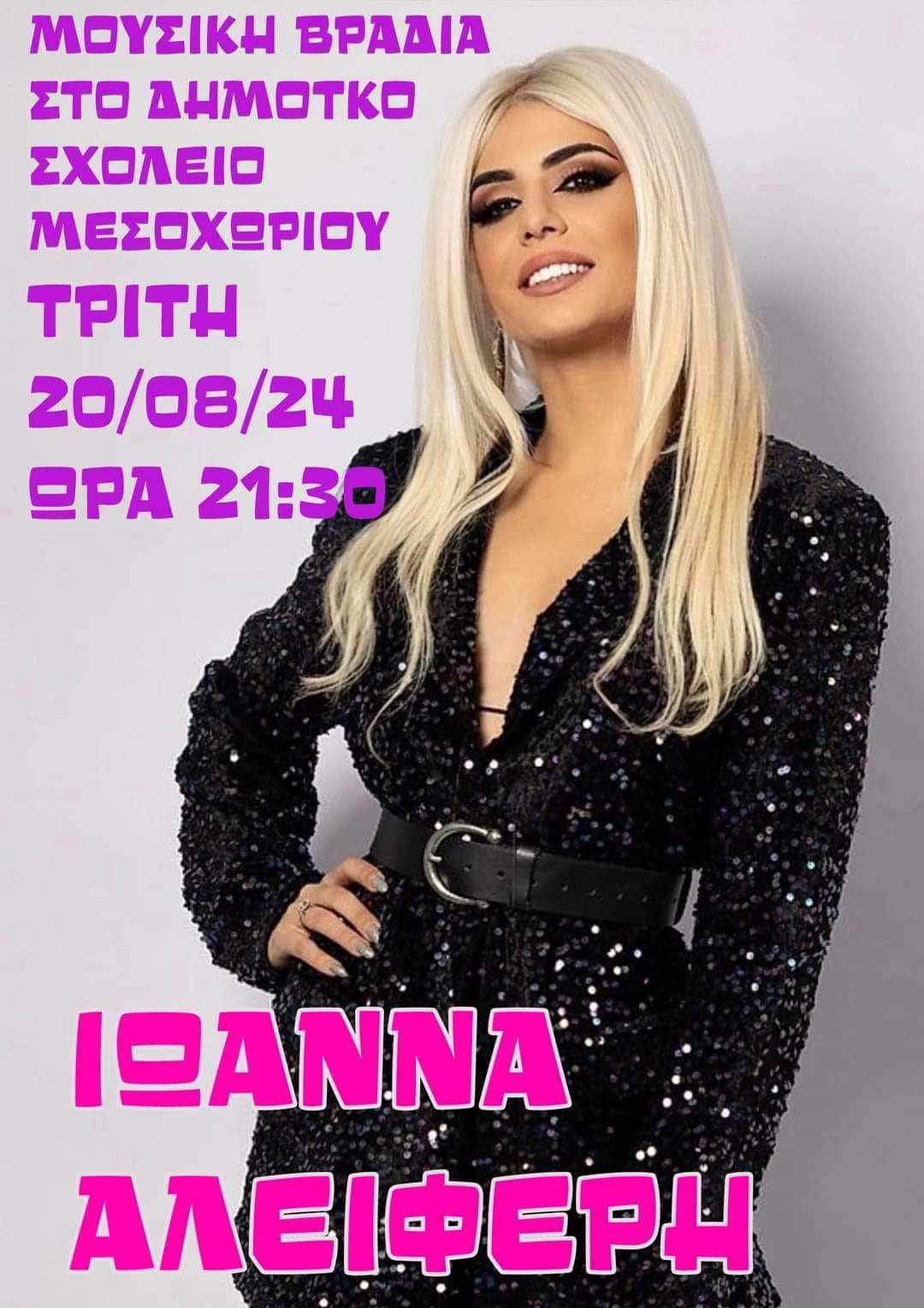 18 Αυγούστου - 9:00 μμ Μουσική βραδιά με την Ιωάννα Αλειφέρη στο Μεσοχώρι Μεσοχώρι Μουσική βραδιά με την Ιωάννα Αλειφέρη στο Μεσοχώρι